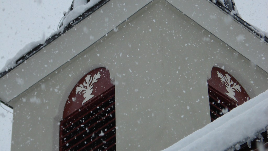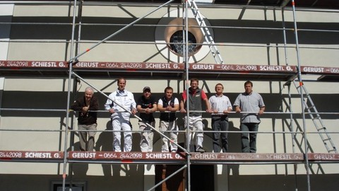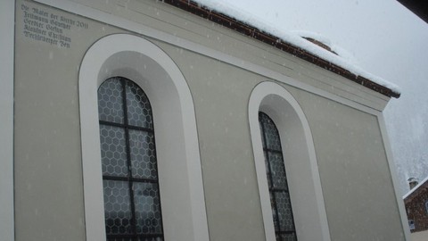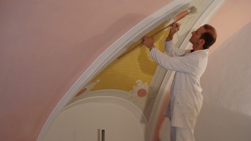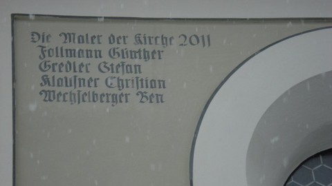 Drinnen der Kalk, von den Holz- und Metallteilen lacht die selbstgemachte Ölfarbe, nur draußen bin ich mit der Purkristallat einen Kompromiss eingegangen, aber es sieht zumindest aus wie Kalk;-) Purkristallat muss ebenso wie Kalk mit der Malerbürste nass in nass aufgetragen werden. Nach der Trocknung ist die Werkspur des Handwerkers noch deutlich erkennbar. Die Farbgebung ist das Resultat einer Befundung, welche bereits vor Beginn der Arbeiten durchgeführt worden ist. Die Farbfassungen sind klassisch einliniert.